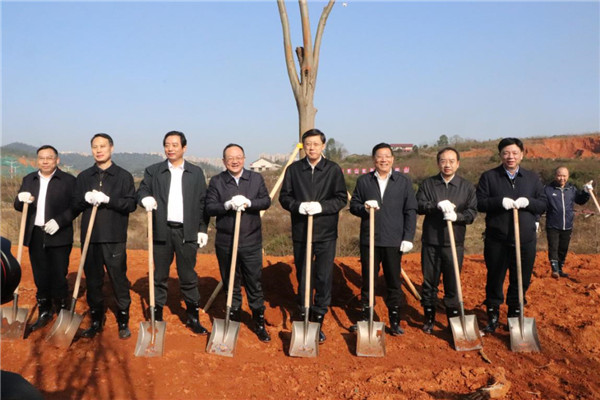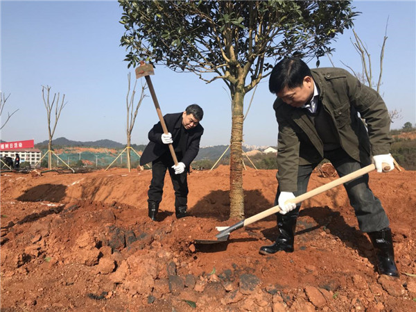 婁底市委書記、市人大常委會主任劉非(左),萬寶新區(qū)黨委書記伍鵠(右),集團(tuán)董事長梁養(yǎng)賢(中)共同為桂花樹培土