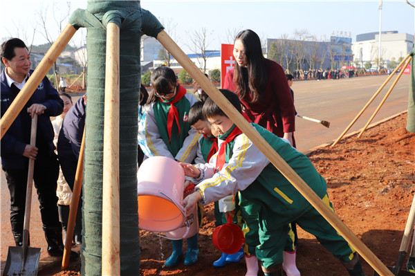振翩學(xué)校學(xué)生代表在老師的帶領(lǐng)下為剛栽好的樟樹澆水